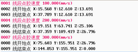 則0002-0003組成的線段以100毫米每秒的速度點(diǎn)膠,0005-0006組成的線段以200毫米每秒的速度點(diǎn)膠,0008-0009組成的線段以300毫米每秒的速度點(diǎn)膠。