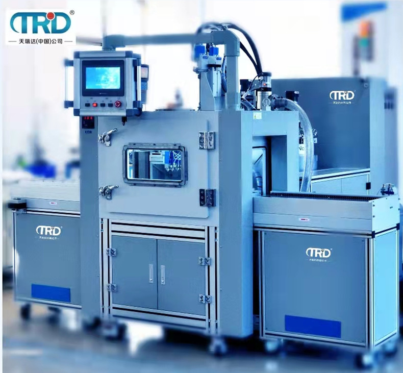 一,真空灌膠機(jī)的優(yōu)勢:然而它的使用基本不受外界環(huán)境所干擾,所以設(shè)備性能穩(wěn)定,注膠精度 高,運(yùn)行可靠。而正是由于這些特性,相比在常壓下灌注,膠水貼度過高氣泡極難消除,產(chǎn)品內(nèi)部有 氣泡膠水極難滲透,而導(dǎo)致灌出來的產(chǎn)品表面凹凸不平,性能更是相差甚遠(yuǎn)。此時真空灌膠機(jī)的作用則可以體現(xiàn)出來,真空灌膠機(jī)是保持在絕對負(fù)壓狀態(tài)下對產(chǎn)品進(jìn)行3-4次灌注的作業(yè)方式,利用負(fù)壓的作用力,在灌注過程中先將真空箱體內(nèi)的空氣抽走,再進(jìn)行產(chǎn)品灌注,能快速將膠水滲入到產(chǎn)品內(nèi)部,灌注沖擊及膠水跟產(chǎn)品接觸產(chǎn)生的氣泡在負(fù)壓作用下也能快速抽走,從而保證產(chǎn)品的高性能。